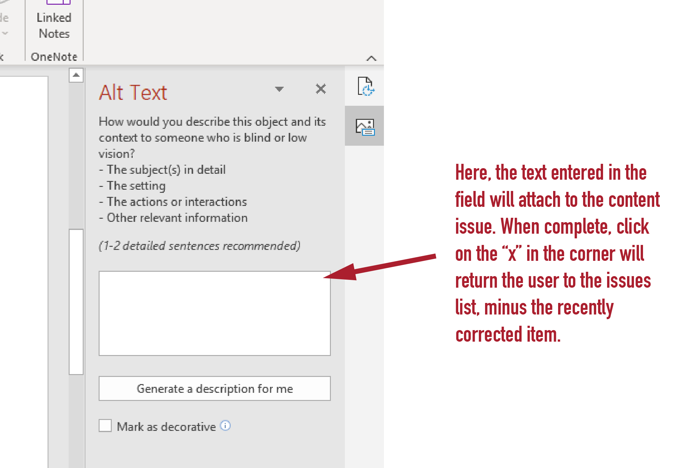 4. Here is a close up of the Accessibility pane. You'll see a list of errors and warnings, with how-to-fix recommendations for each issue.