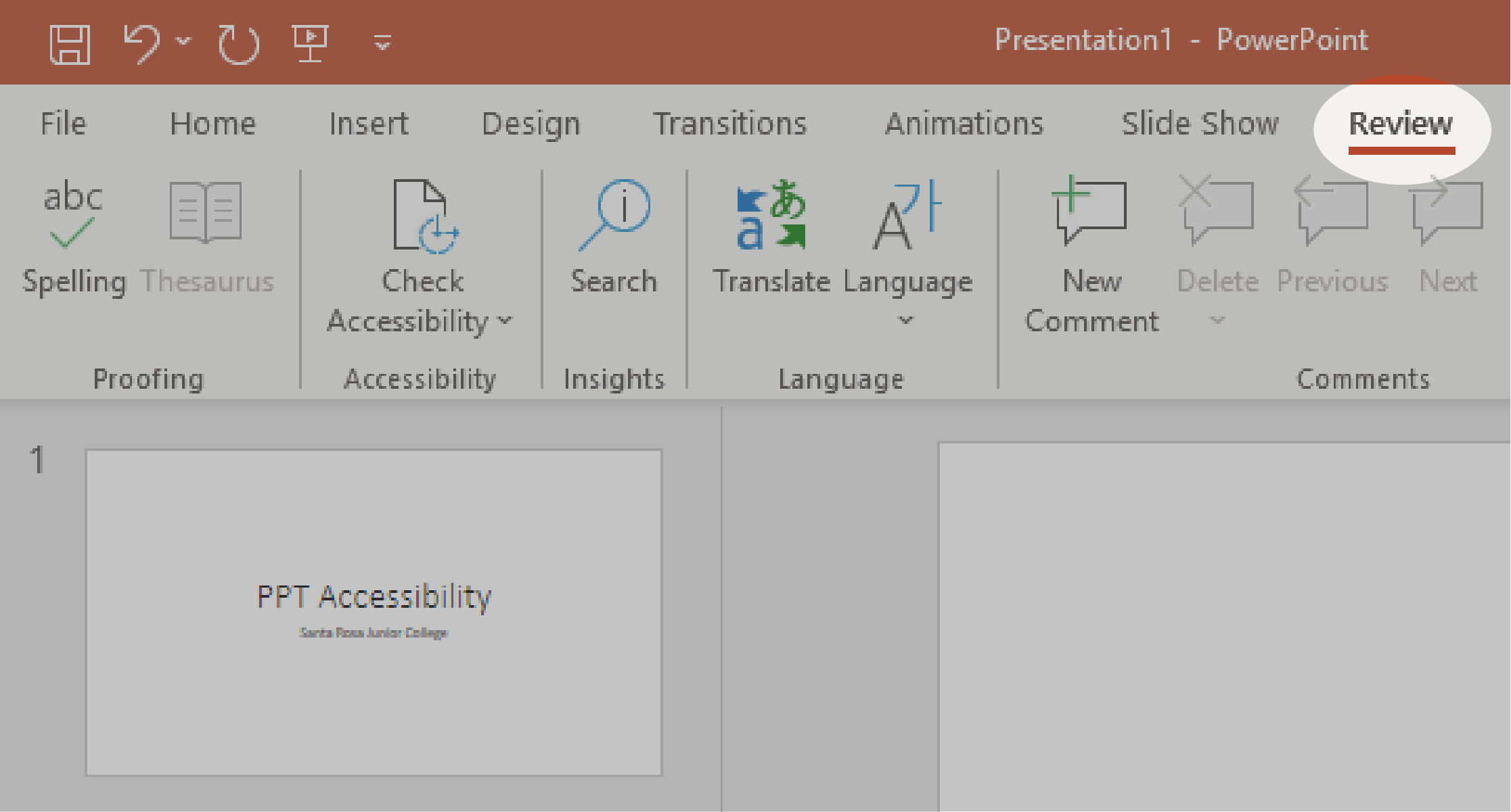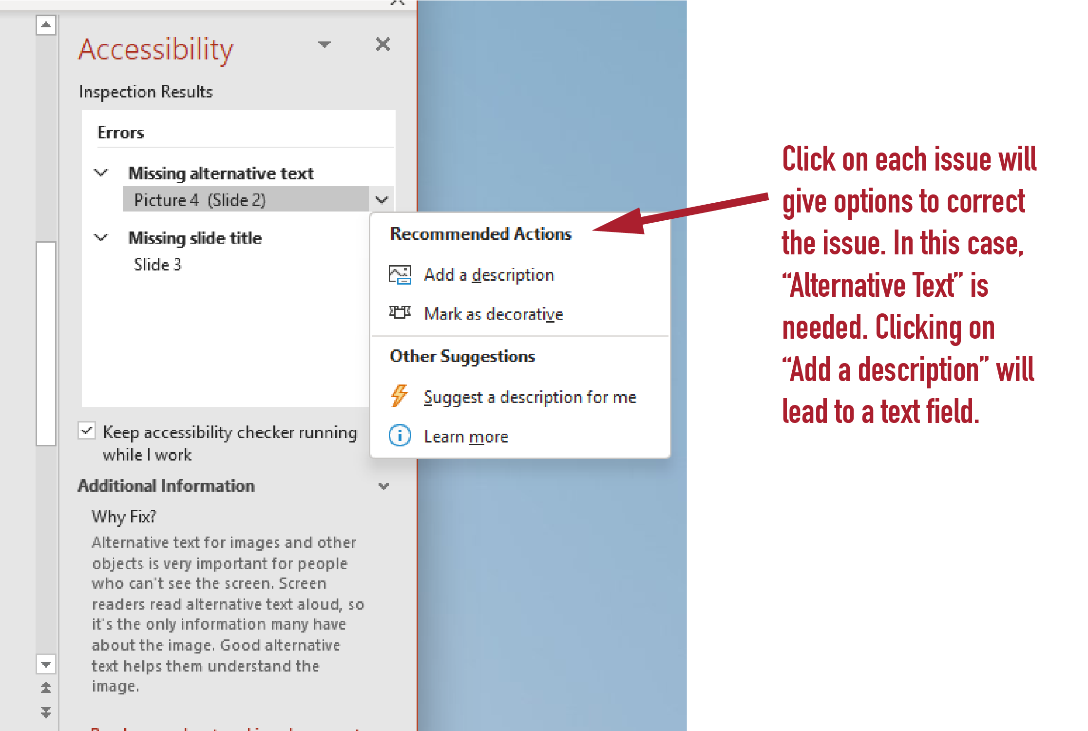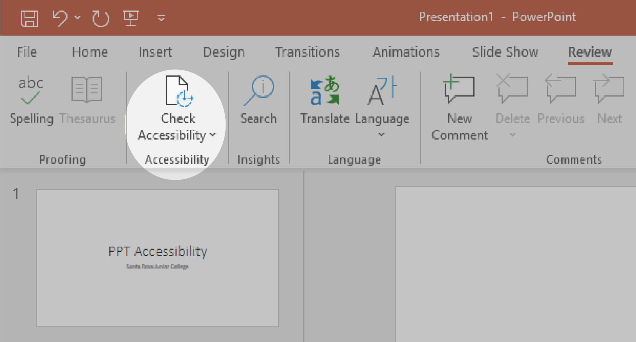 PowerPoint features it's own Accessibility Checker that will examine the contents of your PowerPoint Presentation and make recommendations on formatting to make your Presentation accessible.