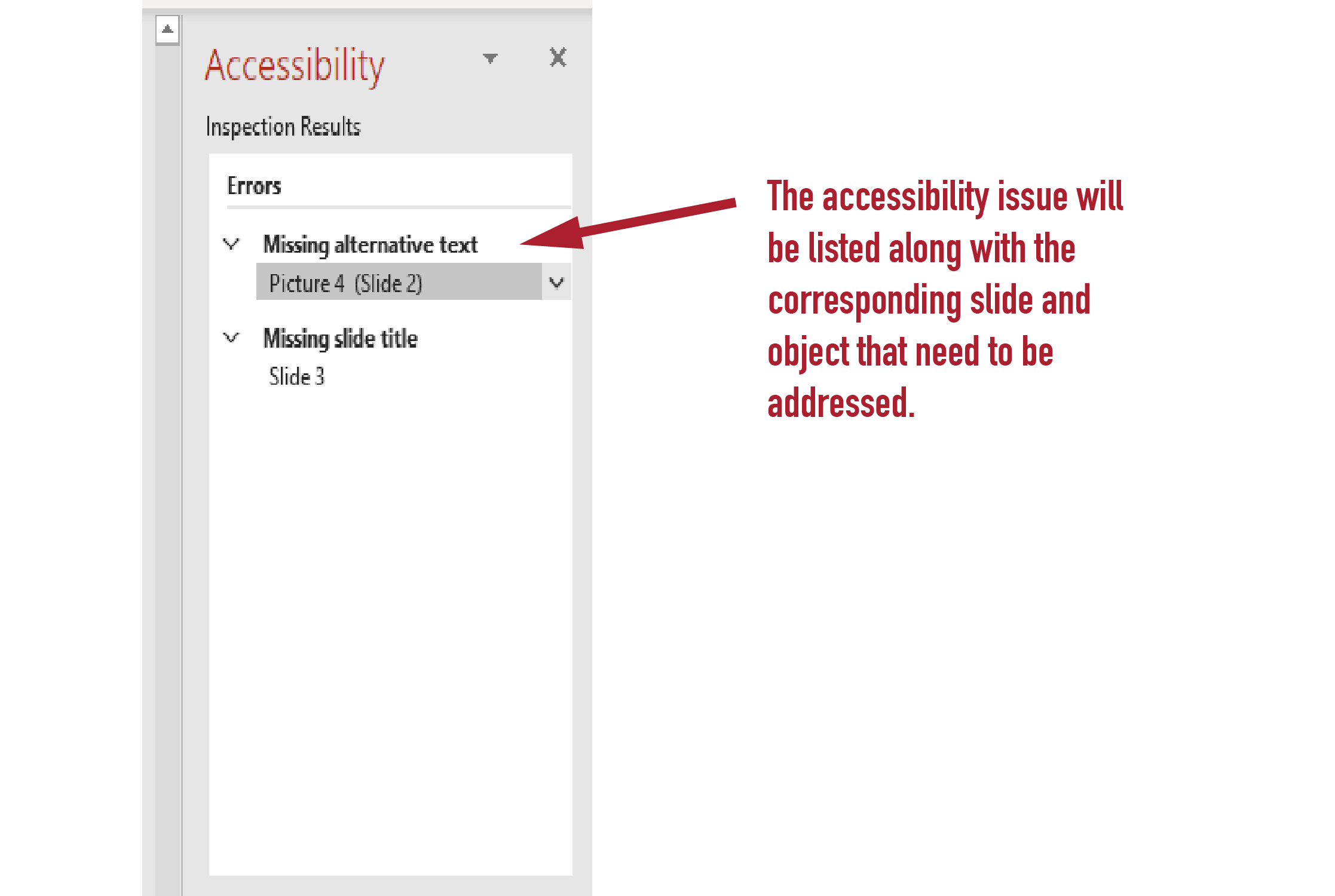 3. In the Accessibility pane, review and address the findings under Inspection Results.